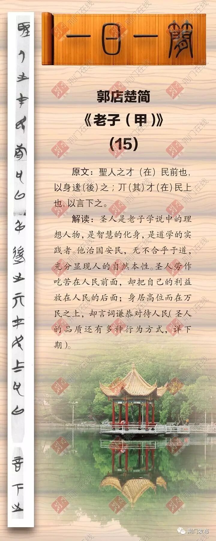 郭店楚简问世后,国内外反响强烈,并迅速形成了国际性郭店楚简研究热潮。它首次揭开了20世纪末以来先秦典籍大发现的序幕,承载的信息和价值反映了中华民族的创造和智慧,为人类文明时代的演进提供了宝贵的资源,在世界文化史上的突出地位将永恒存在,被誉为“改写中国思想史”的典籍。为了加强荆门中华传统文化教育,进一步普及郭店楚简知识,云上荆门开设专栏《郭店楚简释义》,特邀专栏作者崔仁义,以每次解读一句楚简原文的形式,释义郭店楚简《老子》《缁衣》等。敬请关注。