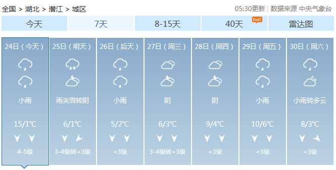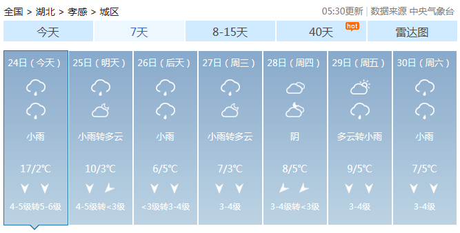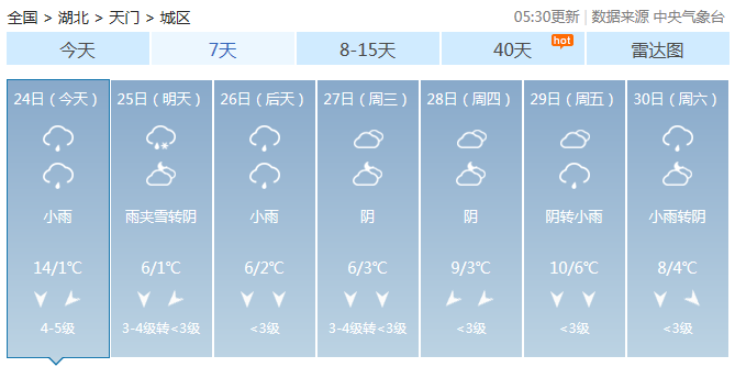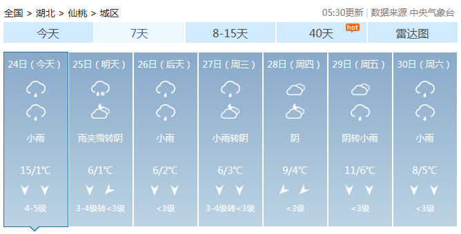 武汉中心气象台预计,受持续冷空气影响,预计11月24-30日,我省将有持续低温阴雨天气,期间有3次降水过程,分别为24日-25日白天、26-27日和29-30日。