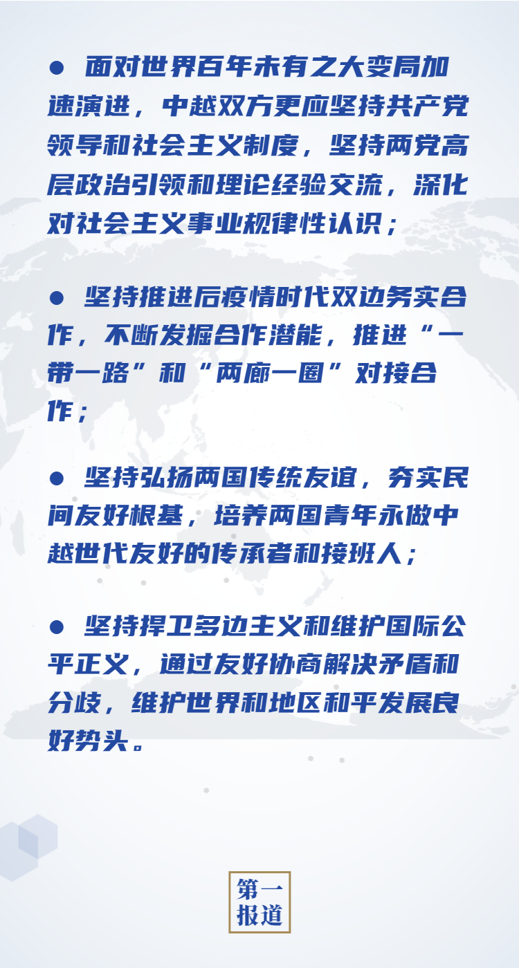 习近平强调,中国和越南山水相连,两国在意识形态、发展道路、社会制度、价值理念等方面高度一致,把双边关系发展好符合两国和两国人民根本利益。今年是中越建交70周年,两党两国关系迈上新的历史起点。疫情之下中越双边贸易等合作呈现出强劲增长势头,彰显了中越关系的韧性和潜力。面对世界百年未有之大变局加速演进,中越双方更应坚持共产党领导和社会主义制度,坚持两党高层政治引领和理论经验交流,深化对社会主义事业规律性认识;坚持推进后疫情时代双边务实合作,不断发掘合作潜能,推进“一带一路”和“两廊一圈”对接合作;坚持弘扬两国传统友谊,夯实民间友好根基,培养两国青年永做中越世代友好的传承者和接班人;坚持捍卫多边主义和维护国际公平正义,通过友好协商解决矛盾和分歧,维护世界和地区和平发展良好势头。中国共产党支持越南共产党开好十三大,愿继续为越南社会主义建设事业提供力所能及的支持和帮助。