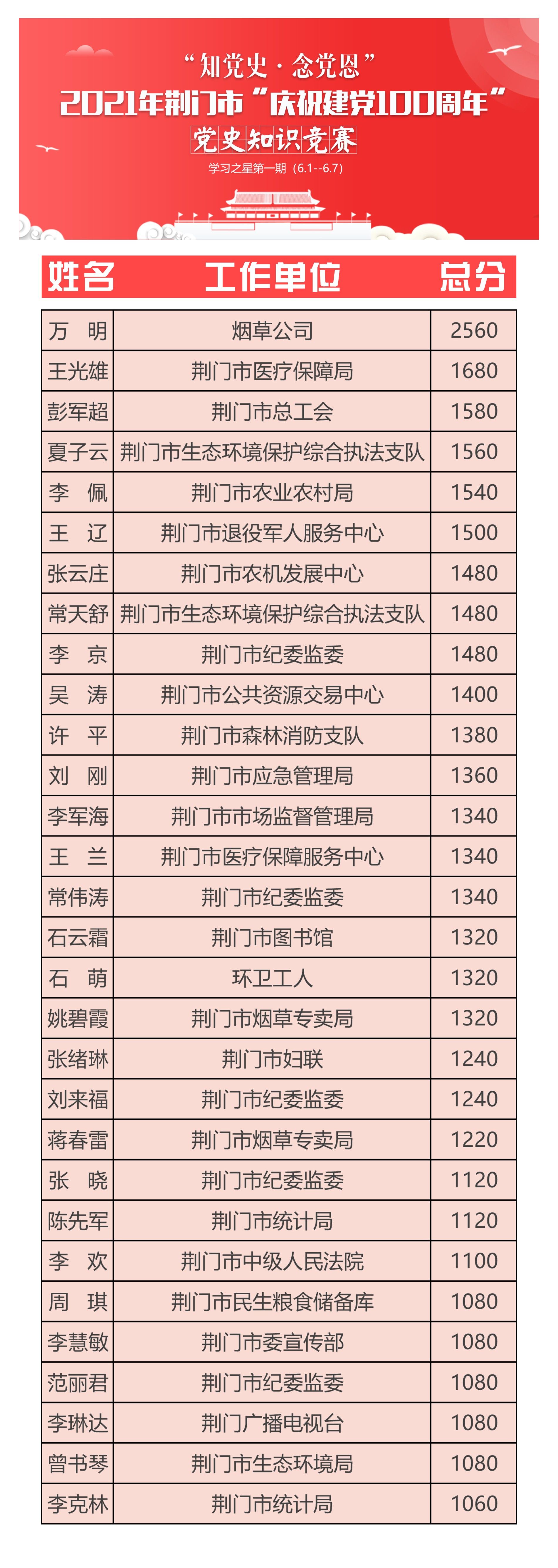 据活动方案,结合党员干部学习答题情况,现推出第一期学习之星,名单如下:
