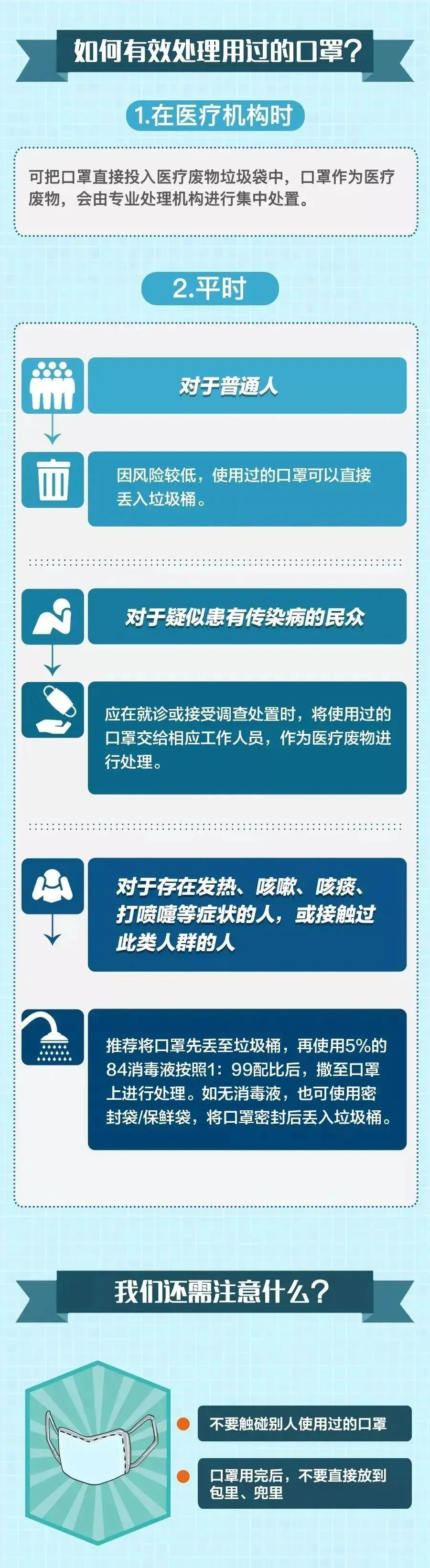 ● 疑似病例或确诊患者佩戴的口罩,不可随意丢弃,应视作医疗废弃物,严格按照医疗废弃物有关流程处理。