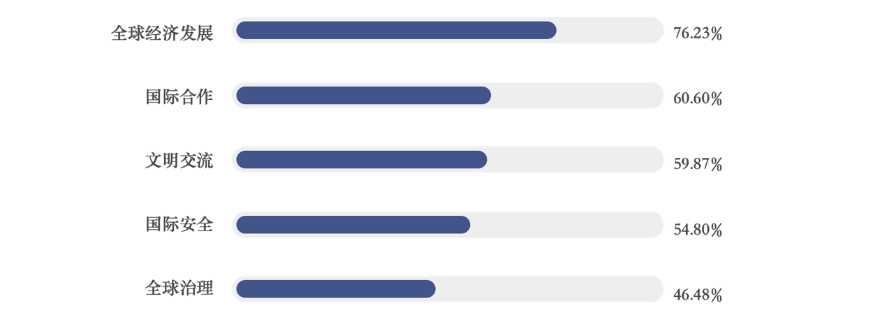 调查中,76.23%的全球受访者认为中国未来将在“促进全球经济发展”方面起到较为关键的作用。此外,在“国际合作”(60.60%)、“文明交流”(59.87%)和“国际安全”(54.80%)等领域,全球受访者也期待中国在未来发挥更加关键的作用。