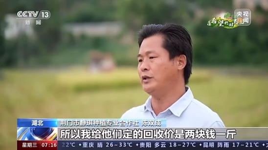 湖北省荆门市静琪种植专业合作社 陈双成:米质特别好,所以我给他们订的回收价是两块钱一斤,每亩田让我们社员多增收1000块钱。