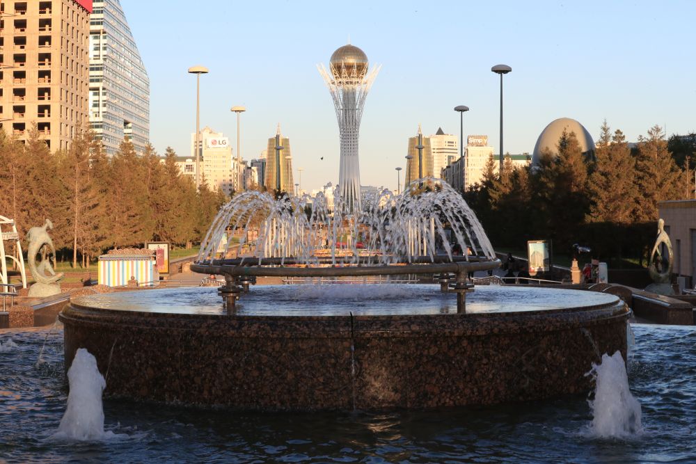 哈萨克斯坦首都努尔苏丹的喷泉和远处的巴伊杰列克观景塔。新华社记者 鲁金博 摄