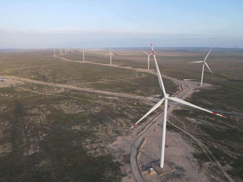 2021年4月25日在哈萨克斯坦扎纳塔斯用无人机航拍的风电场的风机。新华社发(中国电建成都院供图)
