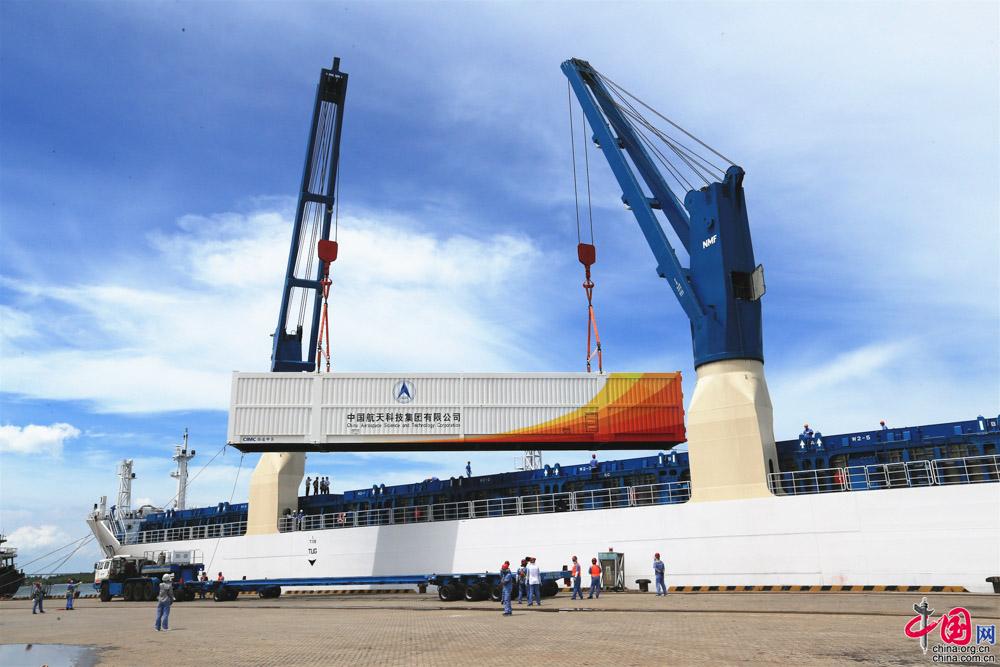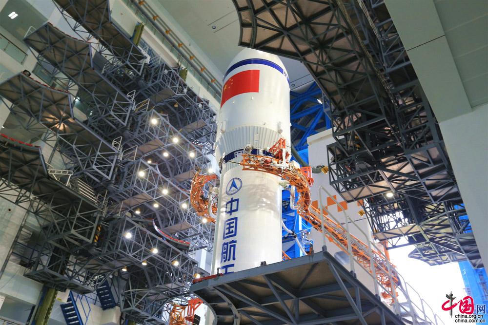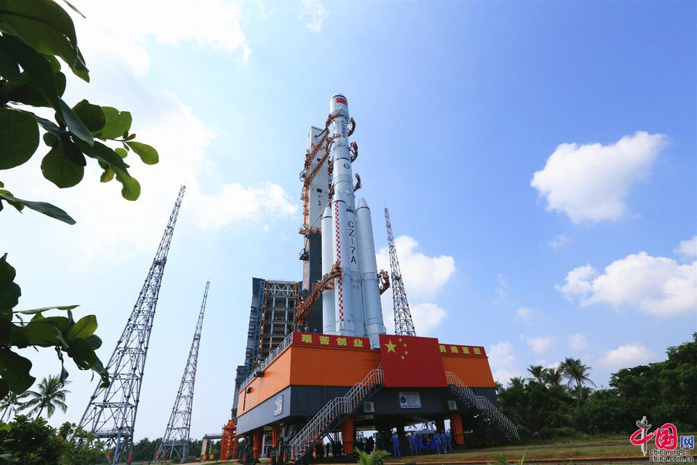 9月13日晚,中国文昌航天发射场。探照灯下,长征七号改遥五运载火箭蓄势待发、剑指苍穹,乳白色箭体上,鲜红的五星红旗和“中国航天”四个蓝色大字格外醒目。