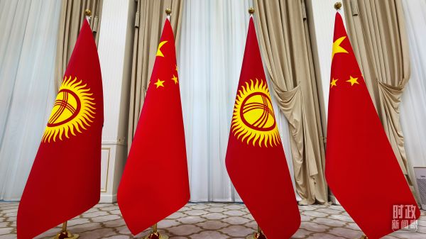 △中国、吉尔吉斯斯坦两国元首会见现场摆放的国旗。(总台央视记者曹亚星拍摄)