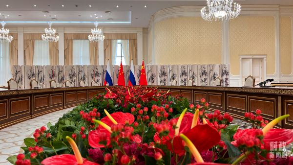 △中俄两国元首会见现场摆放的两国国旗。(总台央视记者薛冠南拍摄)