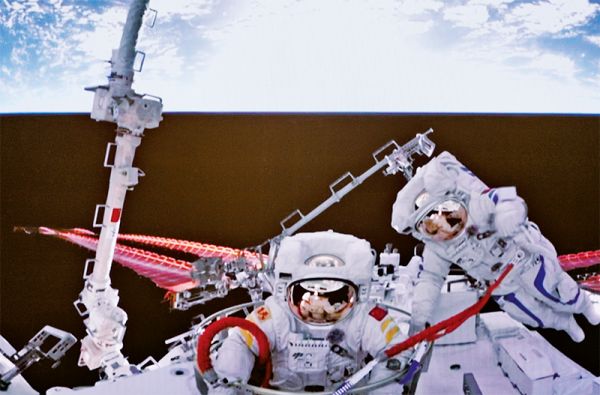 2022年9月2日零时33分,经过约6小时的出舱活动,神舟十四号航天员陈冬、刘洋、蔡旭哲密切协同,完成出舱活动期间全部既定任务,陈冬、刘洋已安全返回问天实验舱,出舱活动取得圆满成功。图为9月2日在北京航天飞行控制中心拍摄的神舟十四号航天员结束出舱任务正在返回的画面。 新华社发 李杰/摄