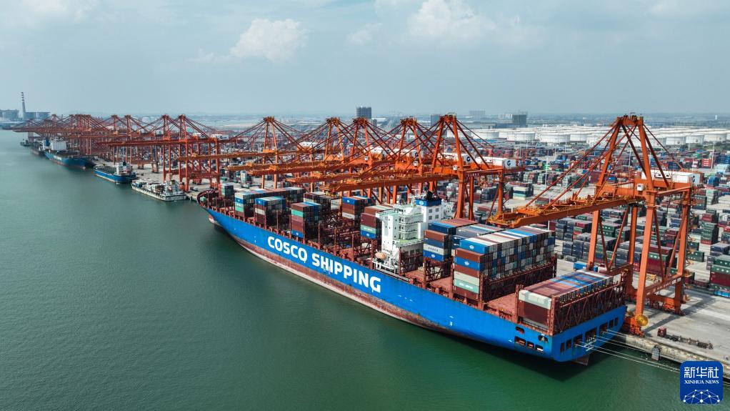 多艘海轮停泊在钦州港集装箱码头装卸货物(2022年9月13日摄,无人机照片)。新华社记者 张爱林 摄