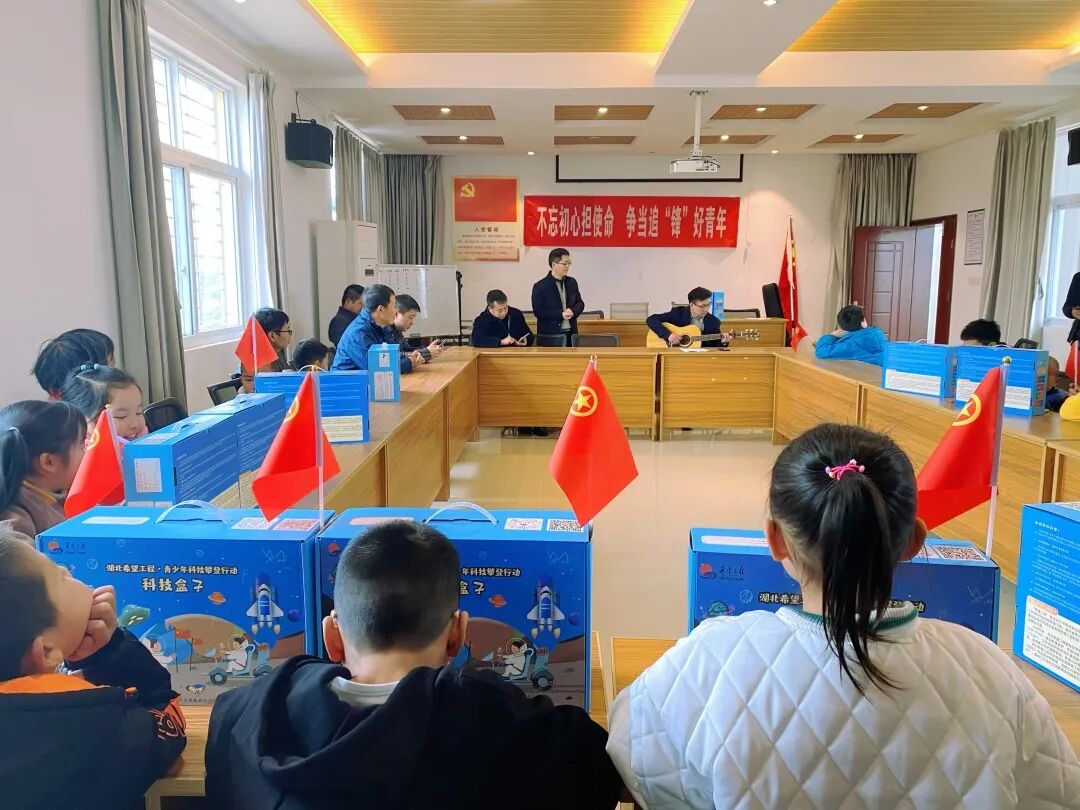 队员唐伟、王宇羲、杨蕊绮首先为小朋友们带去了“希望微心愿”科技礼包,根据儿童年龄大小和科技类别进行分发,每个科技盒子都可以制作出数十个科技小手工,如手摇发电机、地震报警器等,让孩子们体验科技魅力。志愿者赵晓端为孩子们带来了一场吉他音乐课,通过和孩子们演示、互动,让他们感受到音乐的力量,将爱的音符种子播撒进每一个小朋友的心中。志愿者还与孩子们交流互动,倾听孩子们的愿望和理想,肯定孩子们最近在学习上取得的成绩,激发了他们对美好生活的憧憬,鼓励他们自信自强,回馈社会。最后,志愿者龙清冬、吕启明、谭莉组织孩子们一起合唱了耳熟能详的《孤勇者》,再一次将活动气氛推向了高潮,小朋友们挥舞着旗子随着音乐一起合唱,脸上满是温暖的笑容。