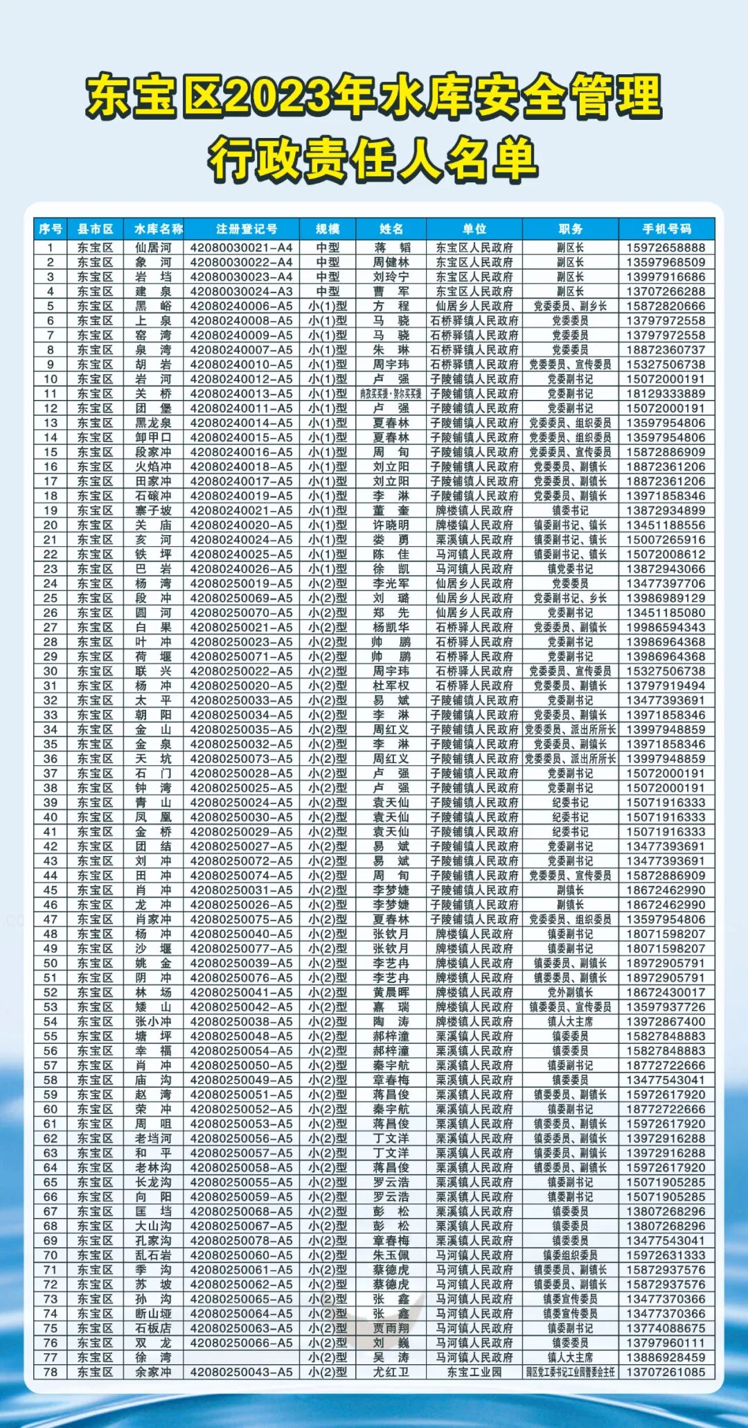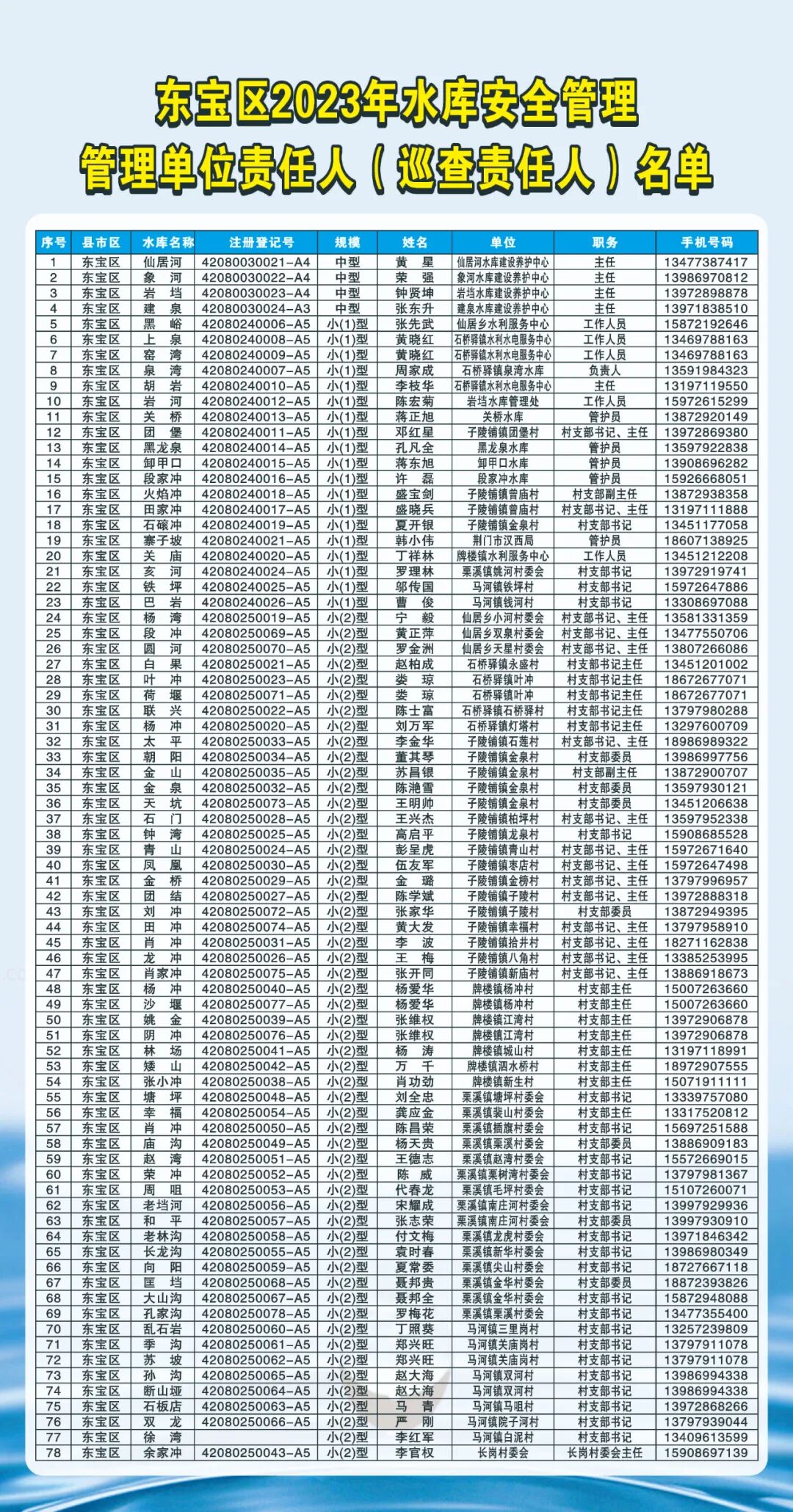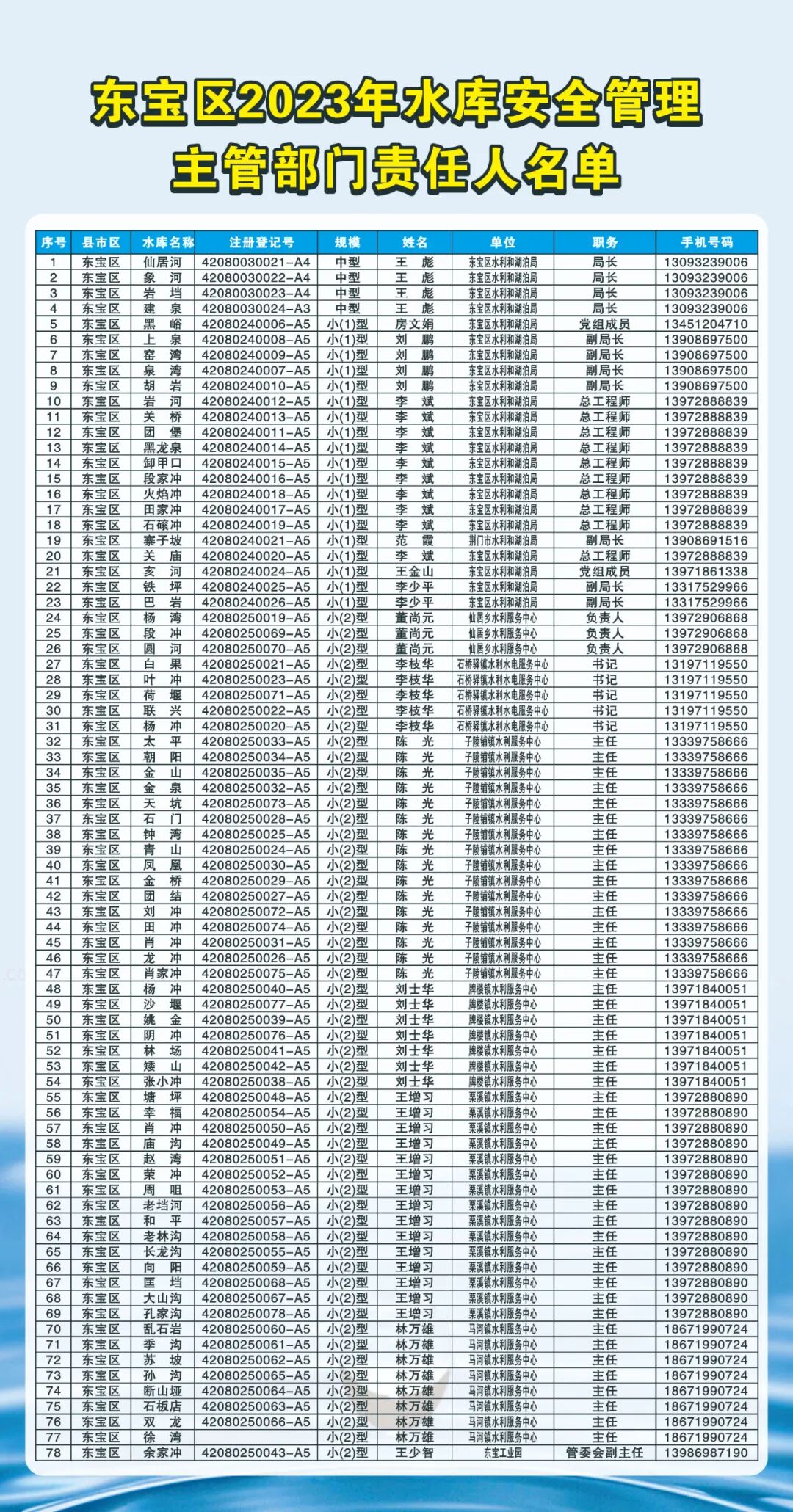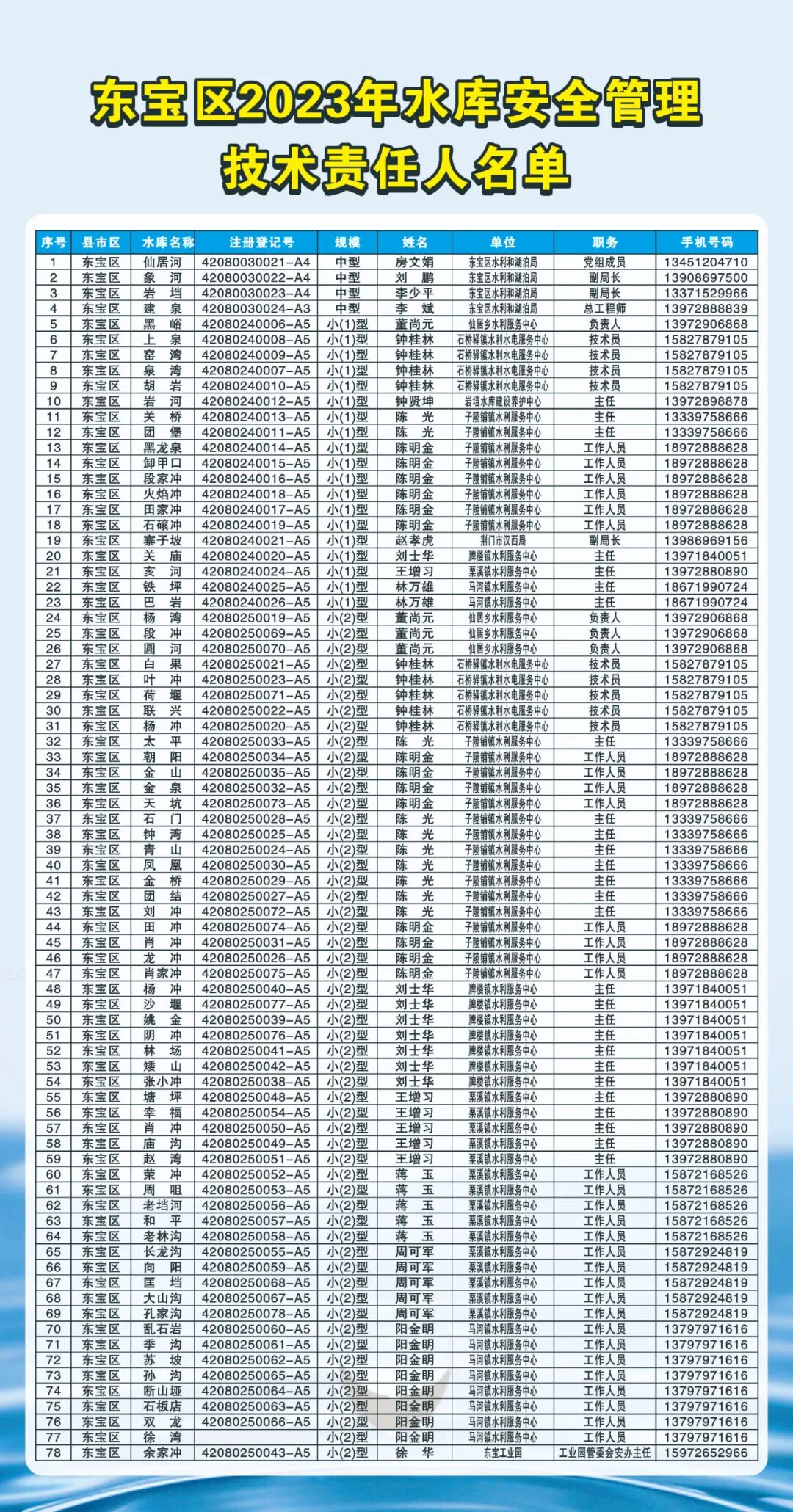 为认真做好全区防汛抗旱工作,切实加强水库安全管理,进一步推动水库“四个责任人”履职尽责,保障水库运行安全和综合效益正常发挥。按照《水库大坝安全管理条例》有关规定和水利部、省水利厅要求,根据各地报送情况,现将2023年全区范围内78座中小型水库(含市直管寨子坡水库)“四个责任人”名单予以公布,接受社会监督。
