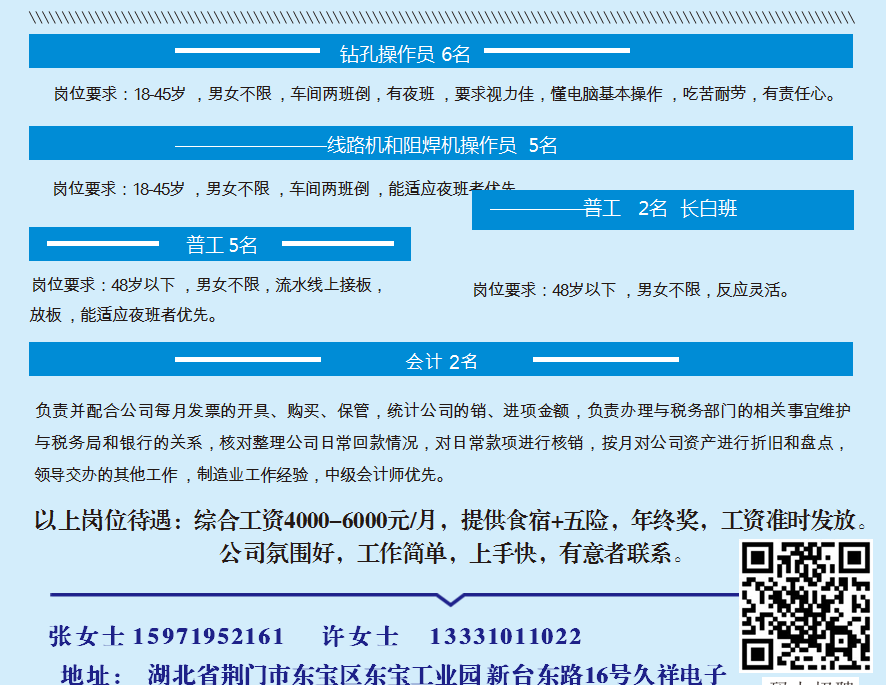 招聘岗位:压贴操作工2名,年龄25-45岁,初中以上学历。