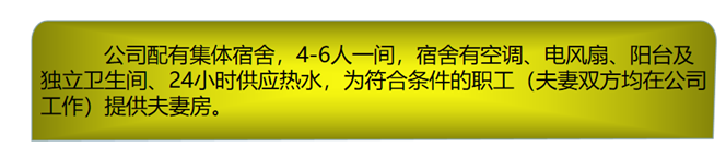 公司福利介绍:1. 提供食宿(宿舍到工厂上下班有免费通勤班车;公司集体宿舍4-6人间,皆配备空调、热水器、独立卫生间);2.缴纳五险(养老、失业、工伤、医疗、生育),入职即为员工购买商业险;3.节日慰问、法定节假日、生日福利、内购家具优惠、季节性福利;4.超额团体、超额个人现金奖励。每周发放一次;5.提供专业的培训和广阔的职业发展空间。