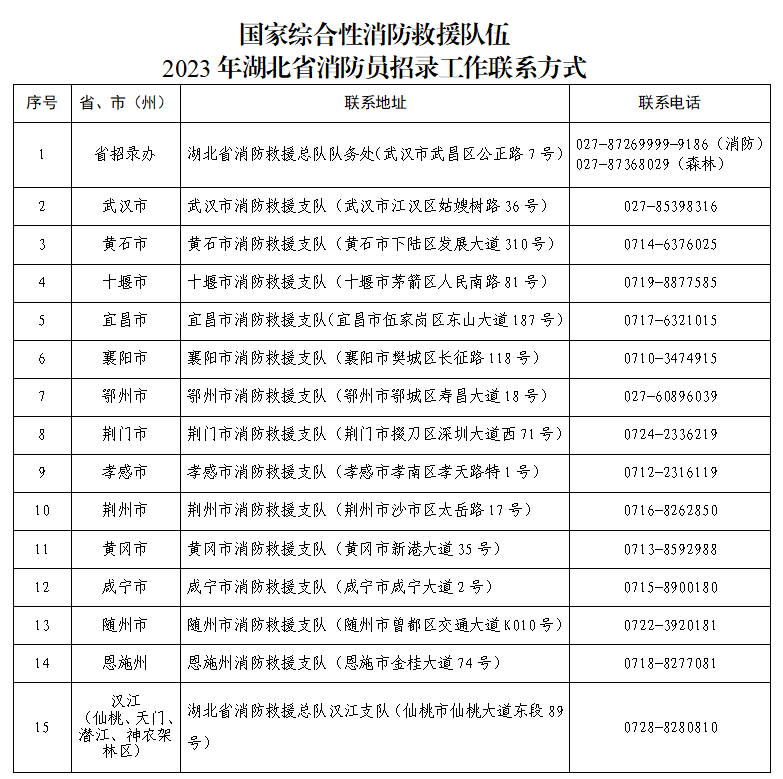 根据《国家综合性消防救援队伍消防员招录办法》(人社部发〔2021〕58号)和《应急管理部关于国家综合性消防救援队伍2023年面向社会招录消防员的公告》(2023年第5号)等文件规定,现就湖北省国家综合性消防救援队伍2023年面向社会招录消防员相关事项公告如下: