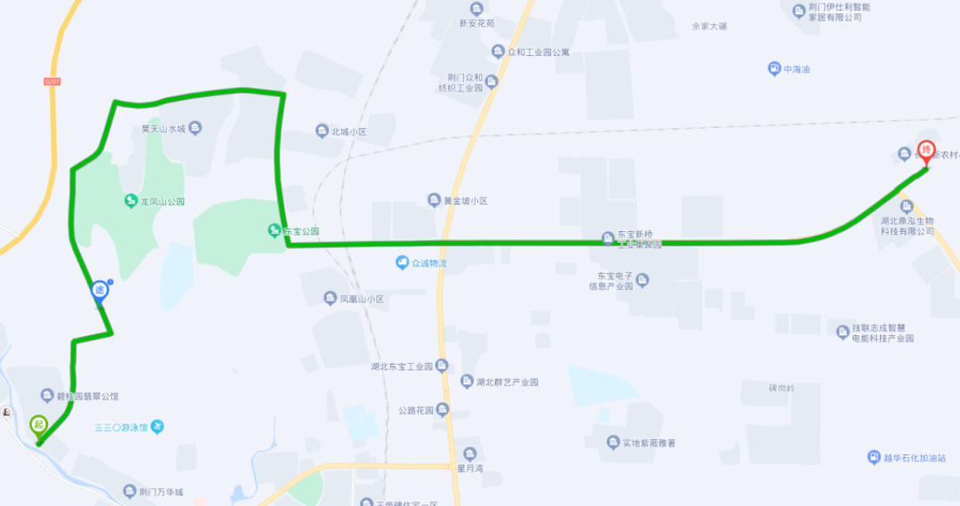线路走向:东宝碧桂园-赵家坡路-无名路(御湖半岛旁)-杨冲路-金龙泉大道-长兴大道-长兴大道长岗新城,双向对开。