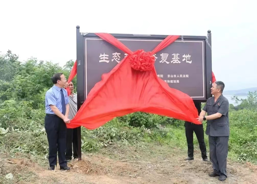 2023年6月2日,荆门市两级法院、检察院与京山市政府相关主管部门,在京山市温泉新区五四村举行荆门市首个“生态环境修复基地”揭牌仪式。该基地集生态修复、法治宣传、警示教育等功能为一体,将此前办理案件中缴纳的损害赔偿款共计32000余元,用于补植复绿等生态修复工作。这一举措是对非法猎捕野生动物民事公益诉讼替代性修复的有益尝试。该基地的建设为开展替代性修复、劳务代偿、异地修复、碳汇补偿等提供有力支持,确保生态司法修复取得应有效果。