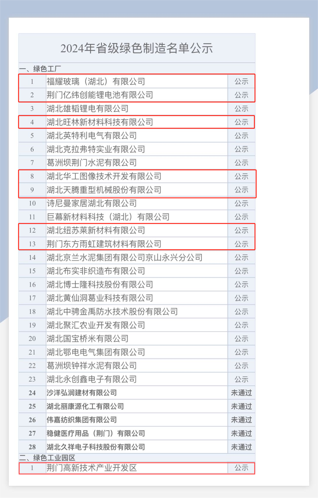 近日,2024年湖北省绿色制造名单出炉。掇刀区福耀玻璃(湖北)有限公司、荆门亿纬创能锂电池有限公司、湖北旺林新材料科技有限公司、湖北华工图像技术开发有限公司、湖北天腾重型机械股份有限公司、湖北纽苏莱新材料有限公司、荆门东方雨虹建筑材料有限公司7家企业成功入选省级绿色工厂,荆门高新技术产业开发区成功入选省级绿色工业园区。