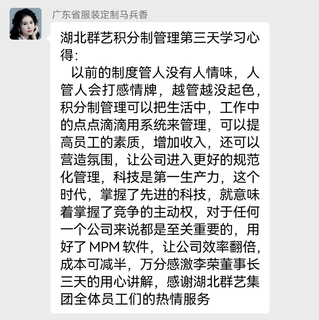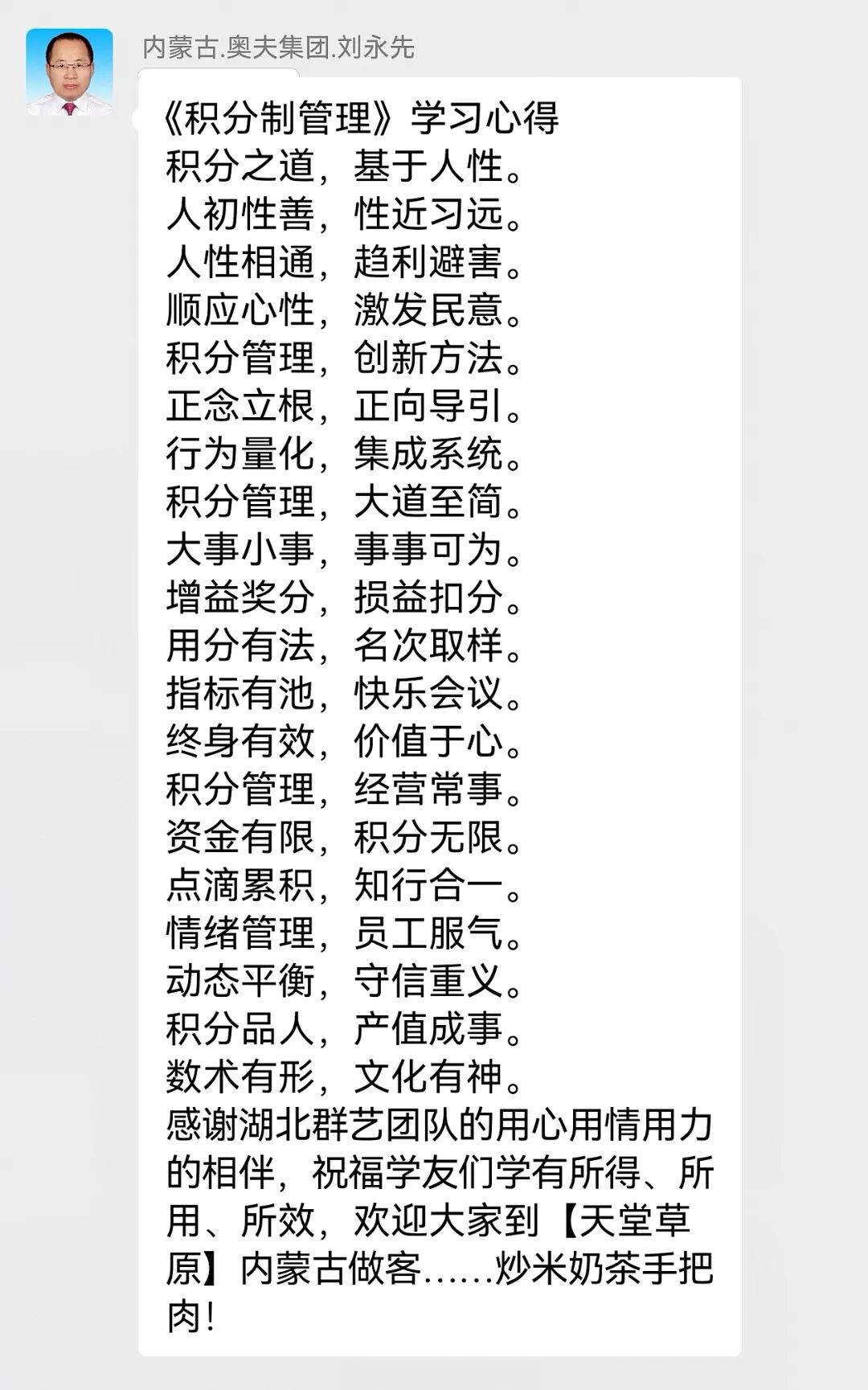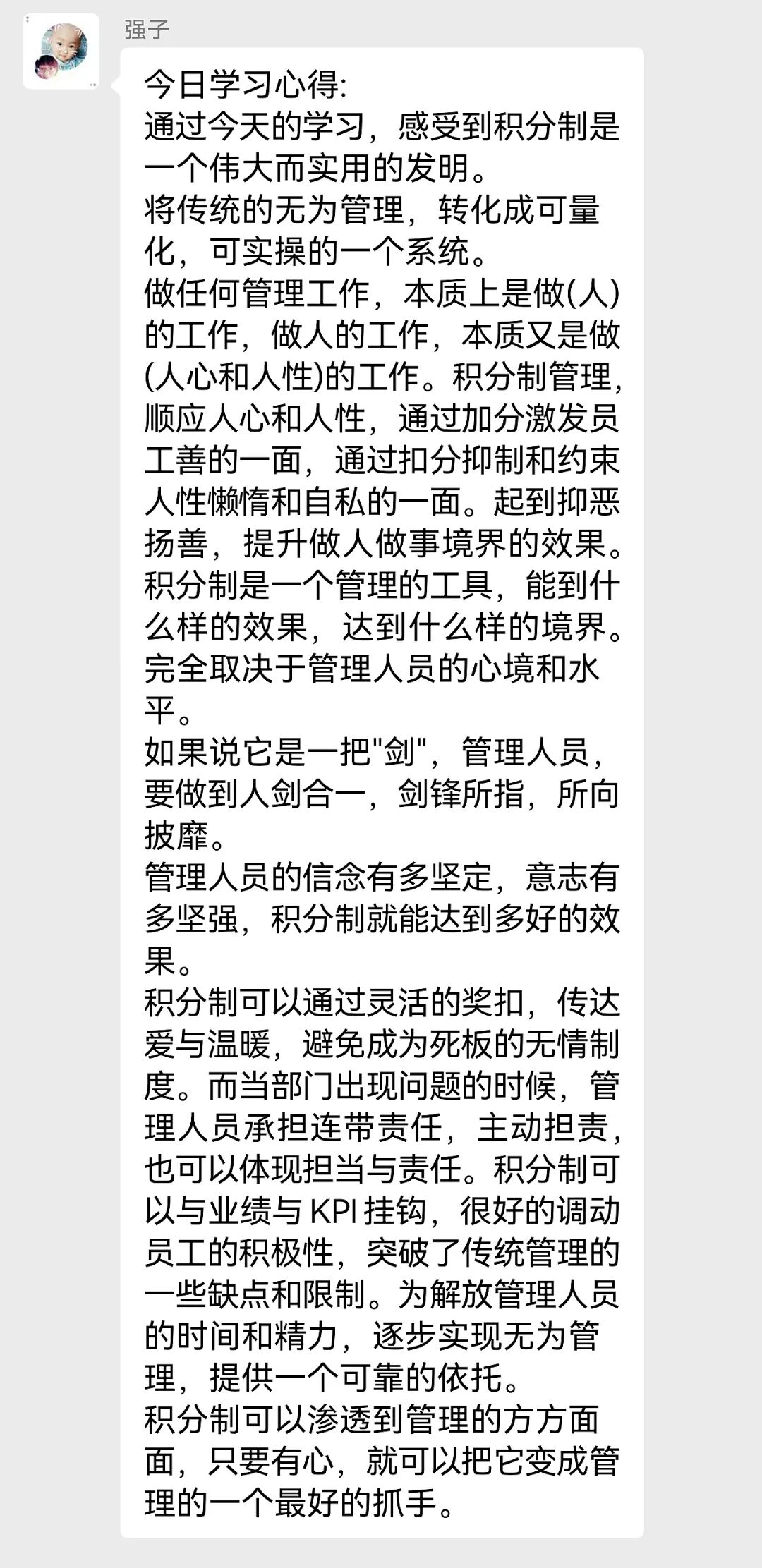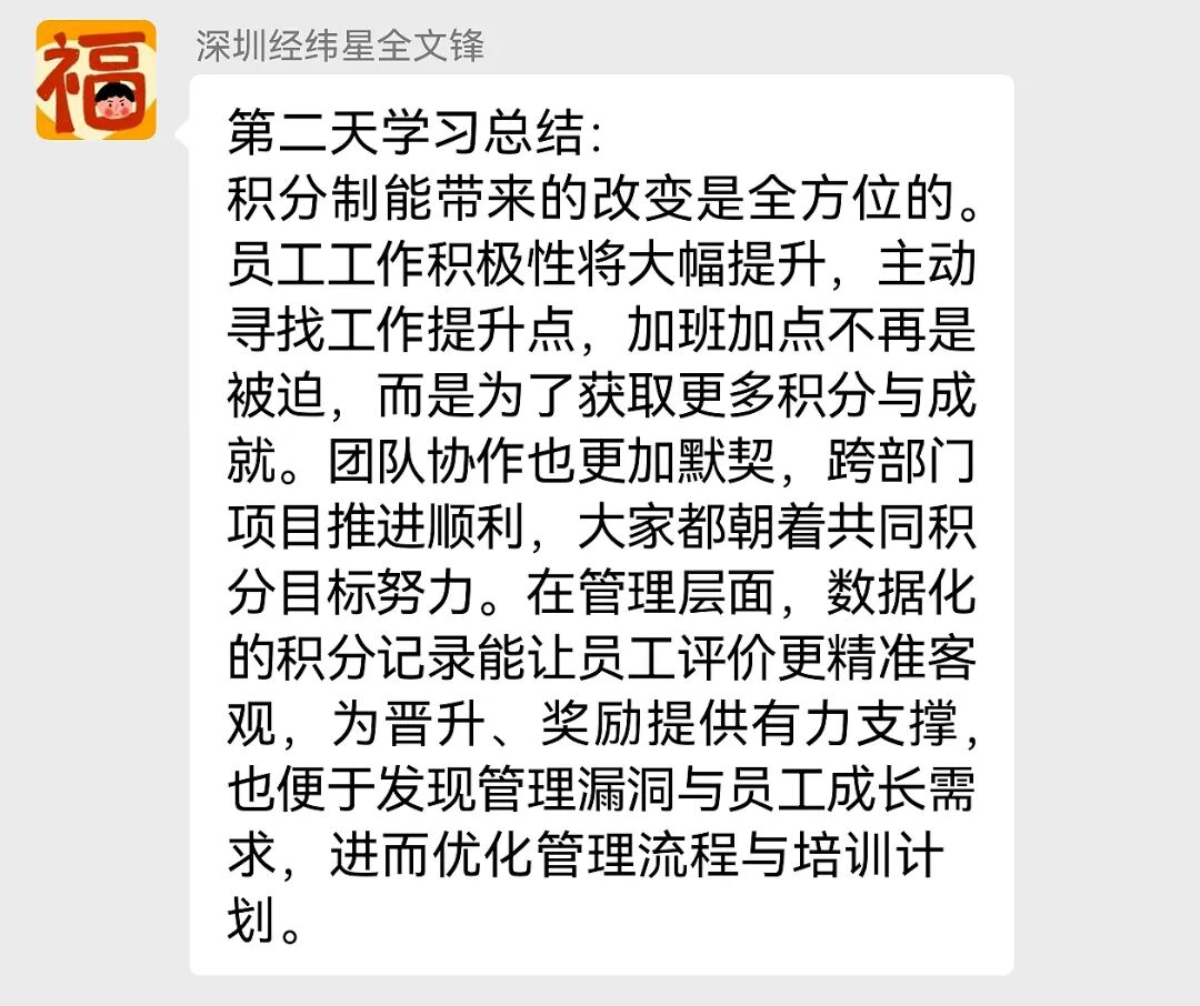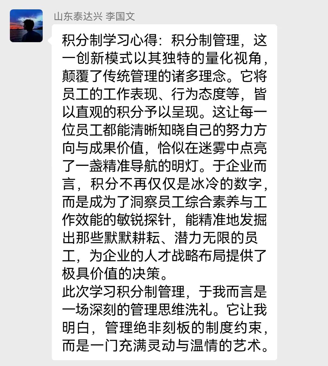 “通过三天的积分制管理学习,积分制管理是一种极具创造性和激励性的管理模式,在亲身体验和深入了解后,我对它有诸多感受。积分制管理能够极大的激发个人的积极性。在这种模式下,每一个行为、每一项成果都有可能转化为积分,这让我们清晰的看到自己的努力和付出能够得到量化的体现与回报。”