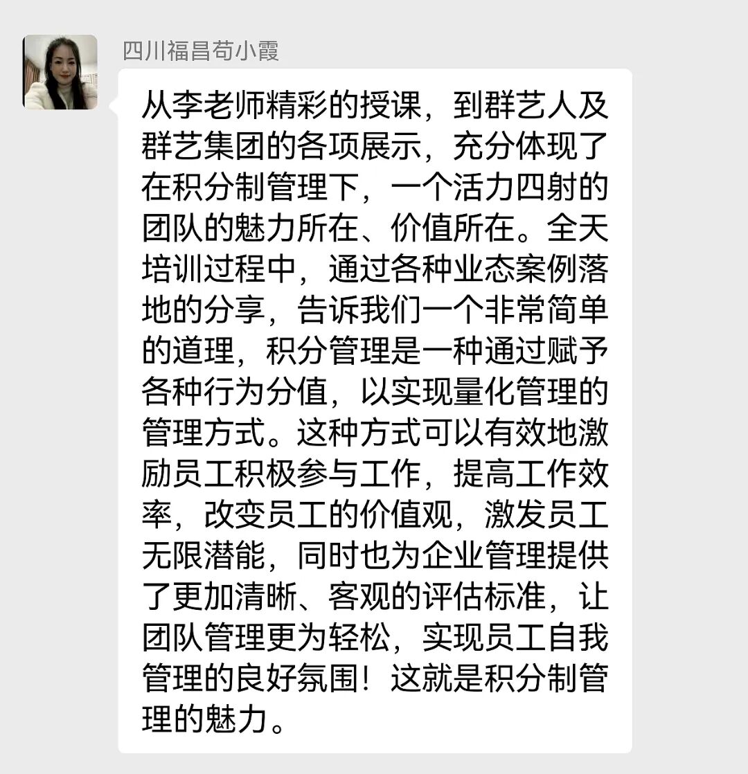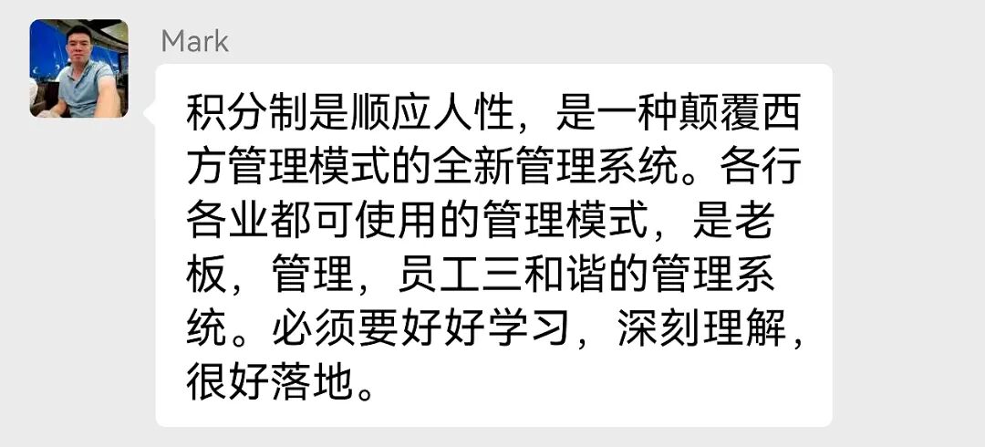 “通过三天的学习,深深被李荣老师的积分制管理的强大魅力所吸引。这套管理系统对于新时代用工环境的变化,市场环境的变化,一个企业如何在这种变化中保持企业的持续经营,提供了一个非常科学、简单、有效、易操作的全新模式。这套系统不仅可用于大企业,也可用于小企业,对于各行业都可导入。非常棒!本人也十分认可这个系统。”