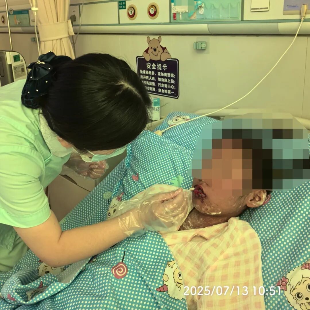 ▲口腔含漱、抽疱液、涂抹表皮……团队精心护理日常