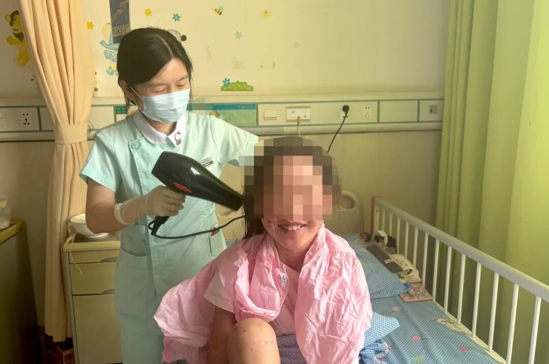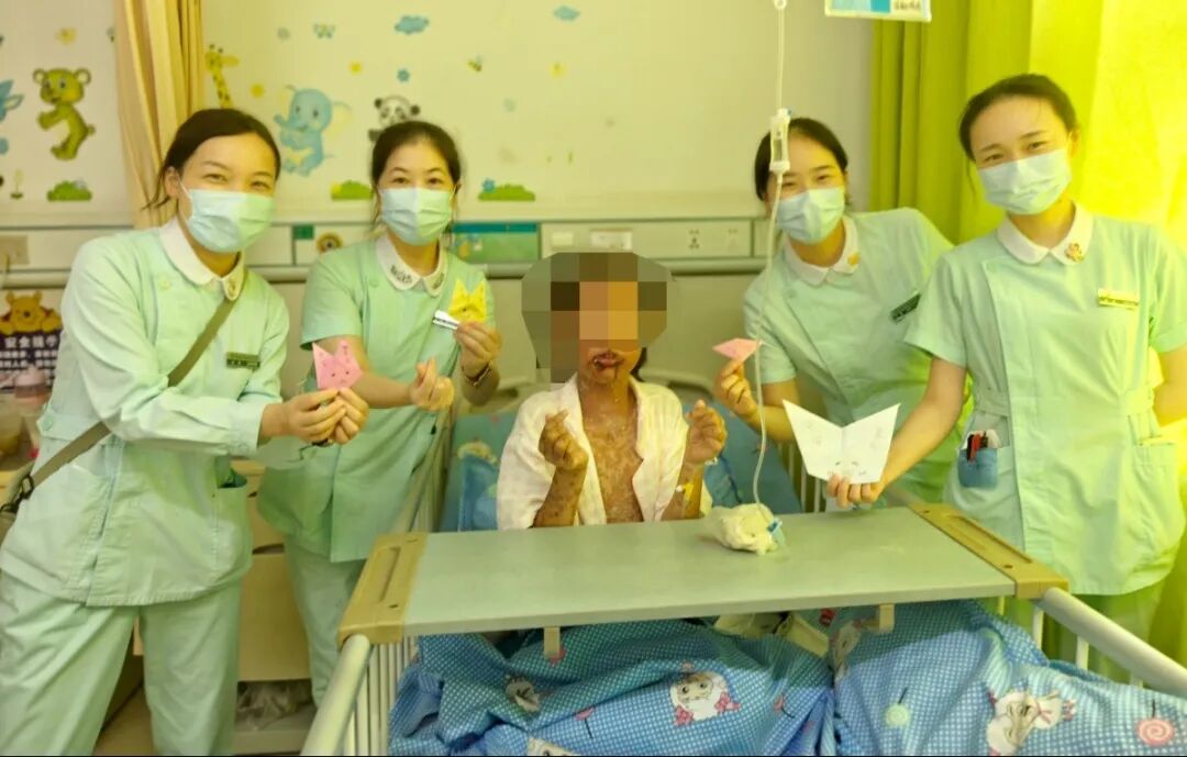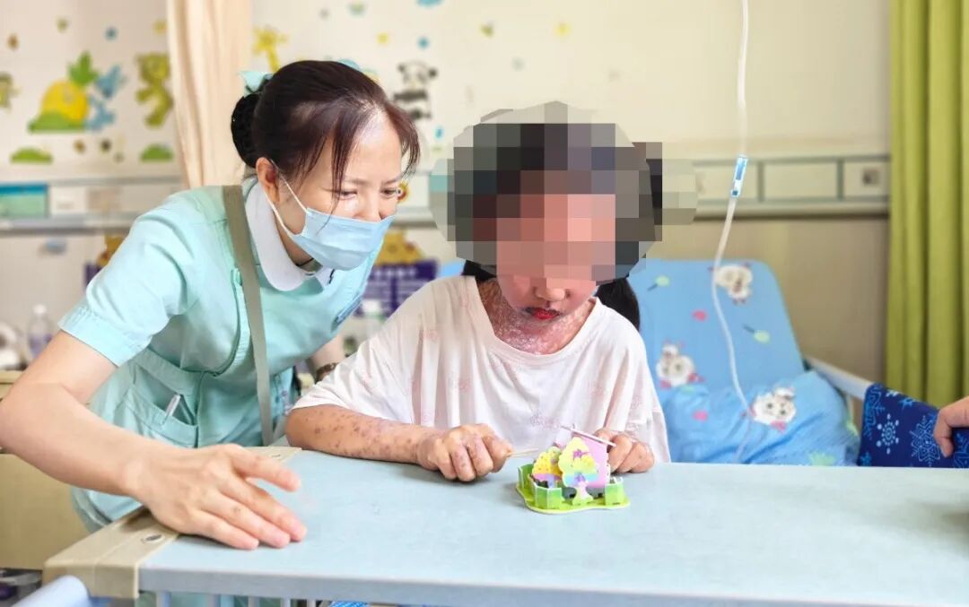 考虑到清洁皮肤、涂药引起的疼痛,护理团队在操作前会预先为小芸进行镇痛处理的同时,通过动画、游戏等方法分散她对疼痛的注意力,最大程度缓解其不适。严格注意操作中的每个细节,时刻关注记录病程变化,以及陪小芸聊天实施心理干预……无一不体现出医护团队严谨细致的护理专业性。