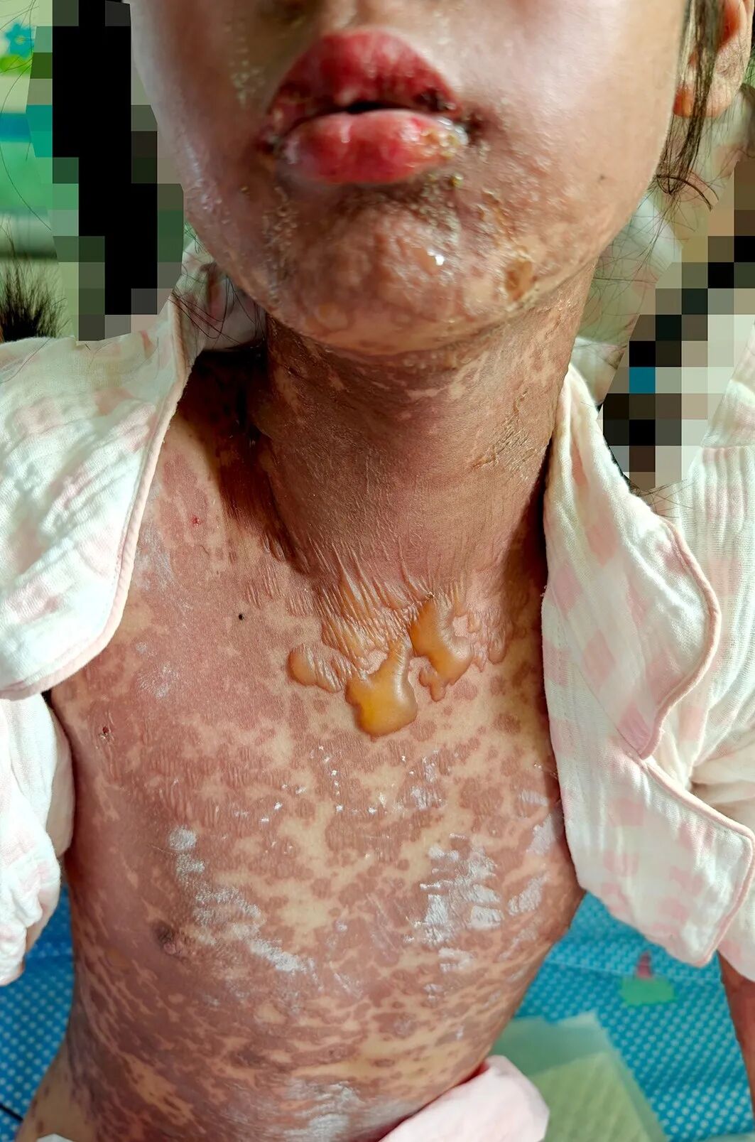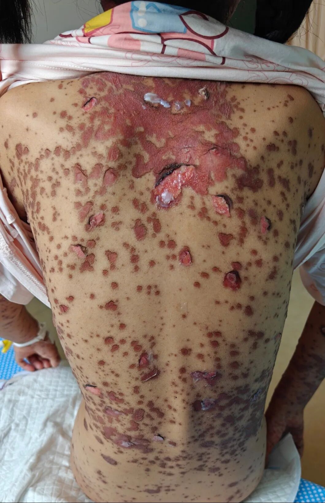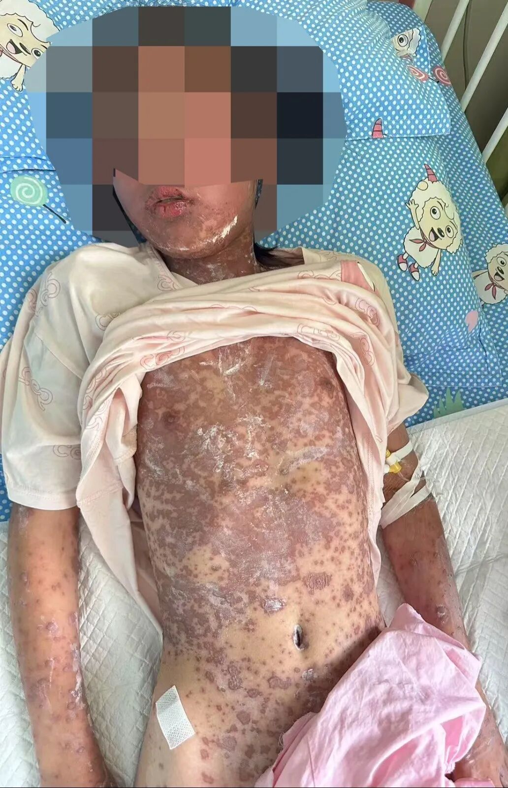 然而,外院住院治疗3天后,小芸的病情不但没有好转,不退烧、皮肤及黏膜损害迅速向全身进展。相继出现了双眼结膜充血伴脓性分泌物、口腔黏膜溃疡糜烂,会阴部溃烂伴分泌物,全身大小不一的水泡,像开水烫伤一样溃破、表皮剥脱,小芸不吃不喝,连张口都变得困难,痛苦不堪。