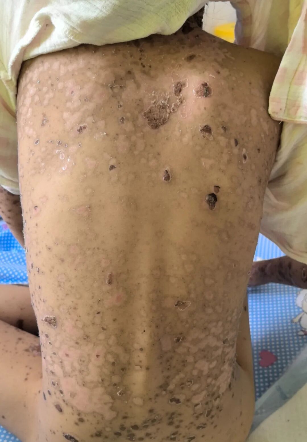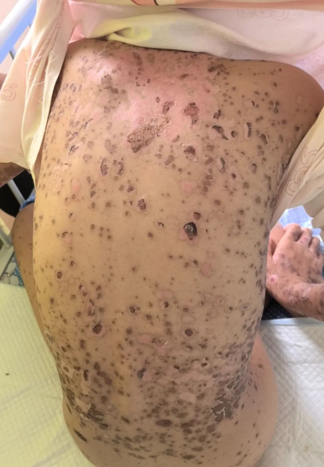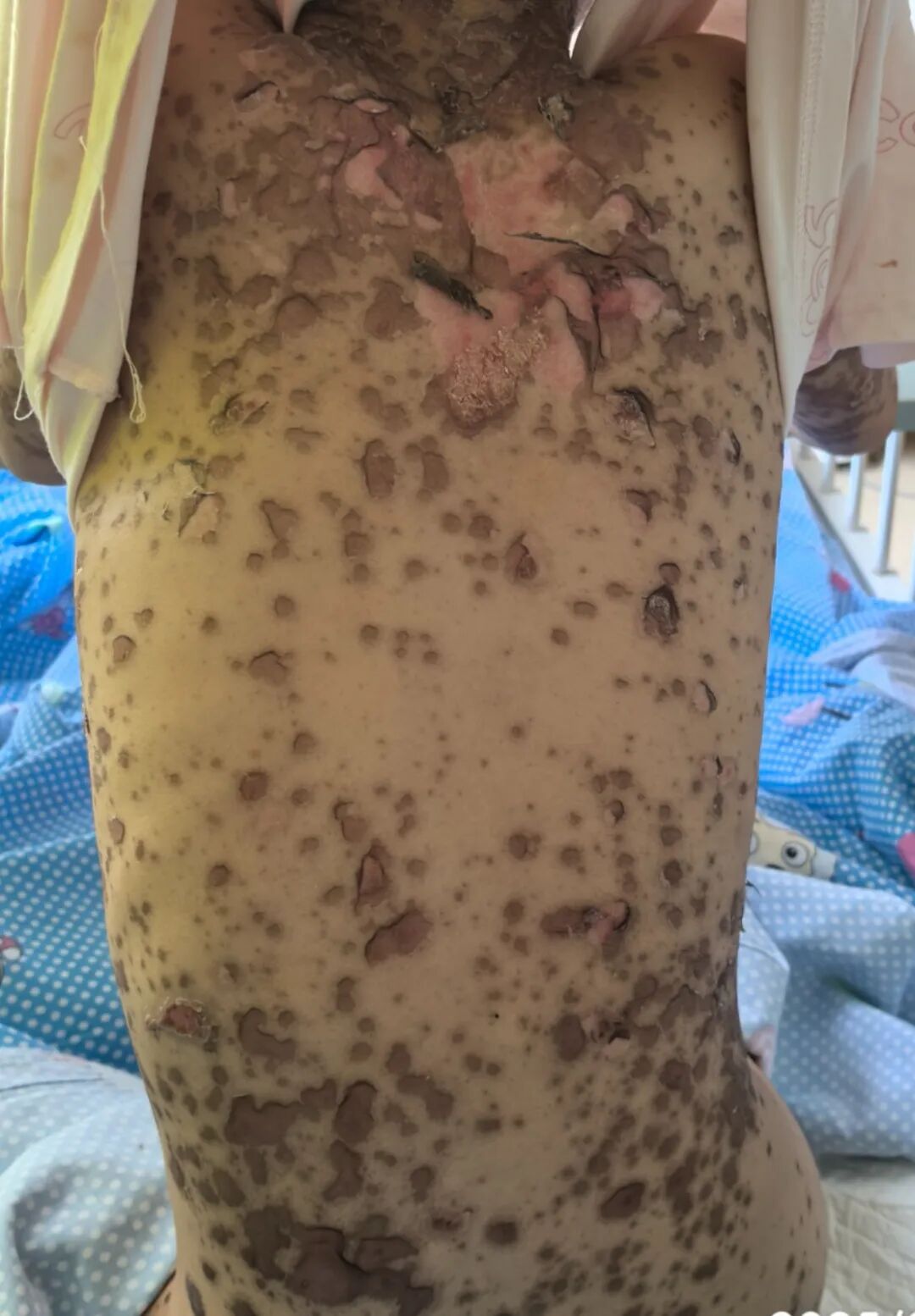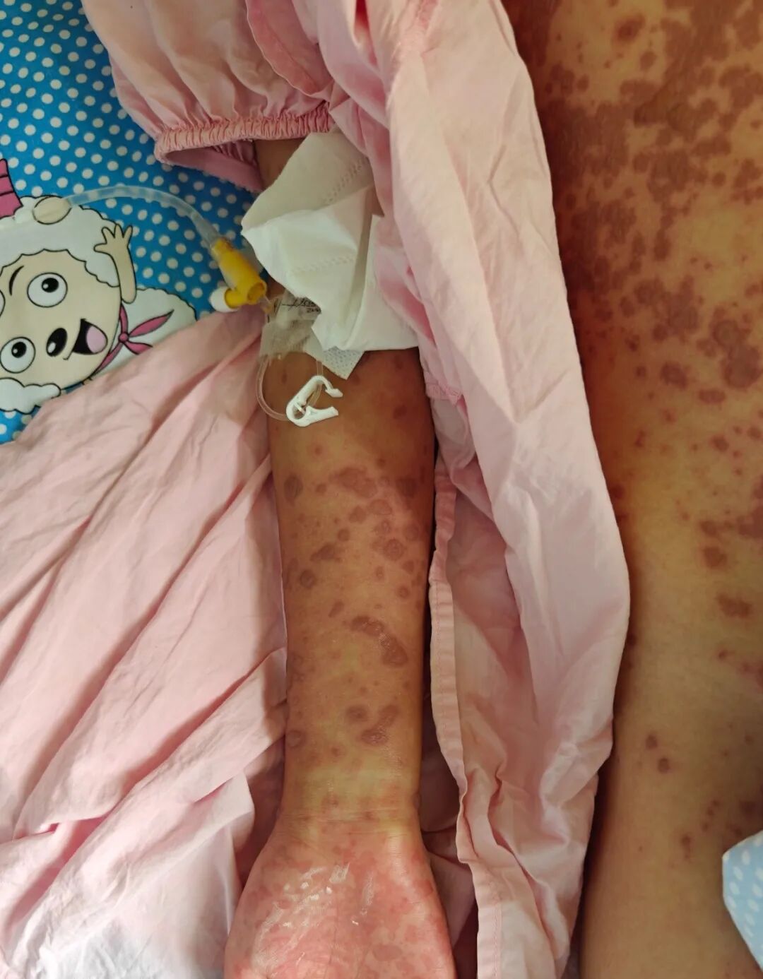 然而,外院住院治疗3天后,小芸的病情不但没有好转,不退烧、皮肤及黏膜损害迅速向全身进展。相继出现了双眼结膜充血伴脓性分泌物、口腔黏膜溃疡糜烂,会阴部溃烂伴分泌物,全身大小不一的水泡,像开水烫伤一样溃破、表皮剥脱,小芸不吃不喝,连张口都变得困难,痛苦不堪。