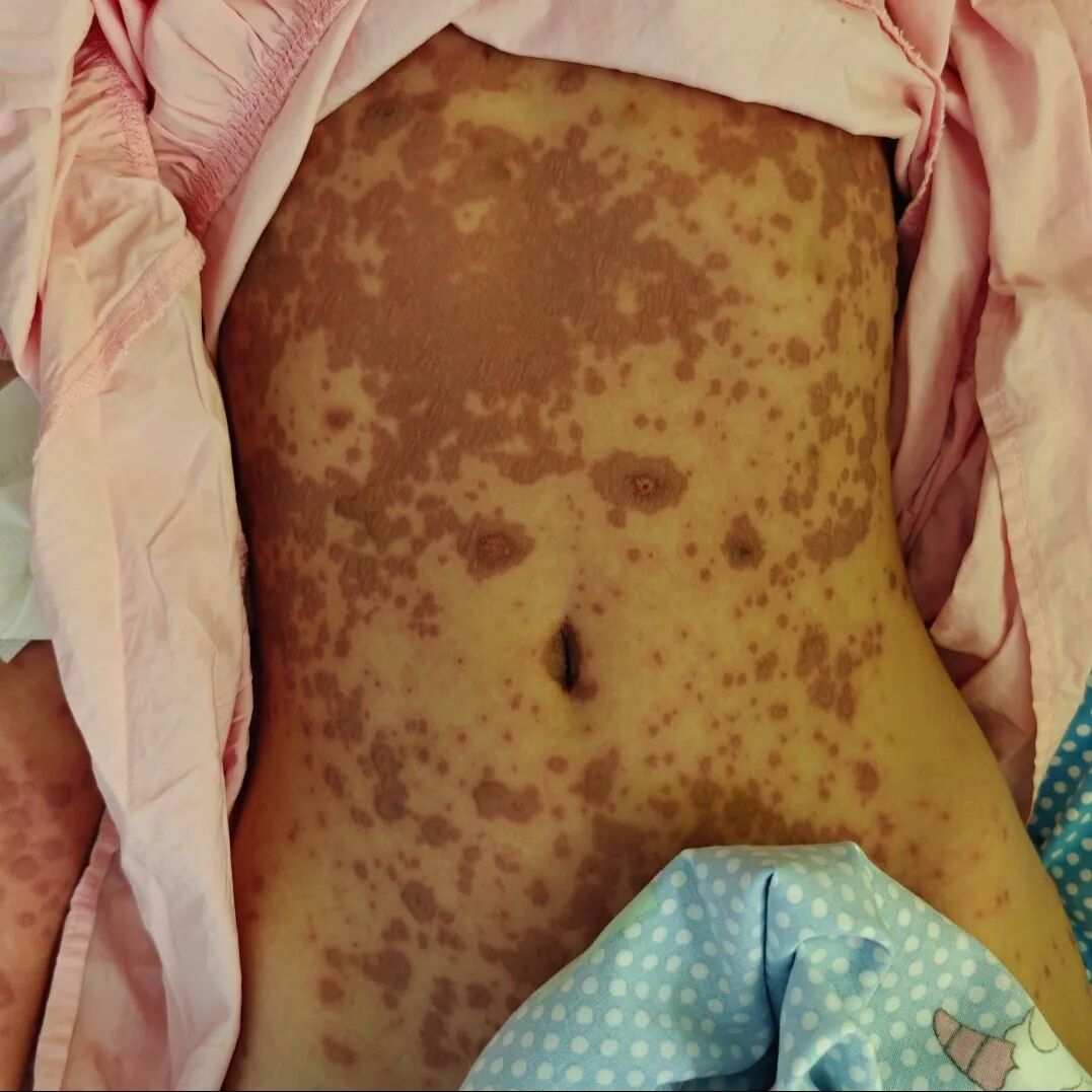 入院时,小芸的状况不容乐观。 “患儿病情危重、进展迅速,需尽快明确诊断并制定治疗方案!”接诊的荆门市人民医院儿科一病区刘士虎主治医师与科主任秦华主任医师立即组织科室人员进行疑难病例讨论,并请会皮肤科会诊后初步考虑为“重症多形红斑型药疹(SJS/TEN)”——暂予甲强龙、丙种球蛋白抗炎治疗,以及万古霉素抗感染等对症治疗。