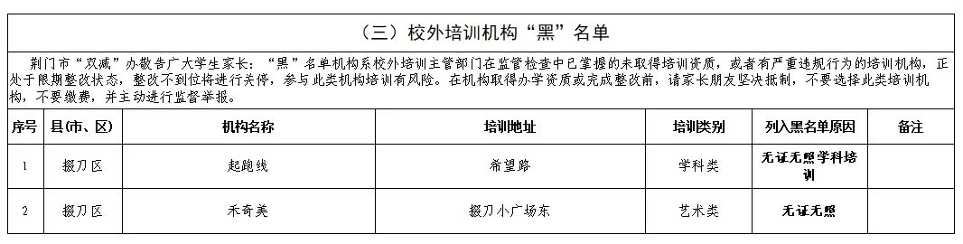 荆门市掇刀区校外培训机构“黑”名单