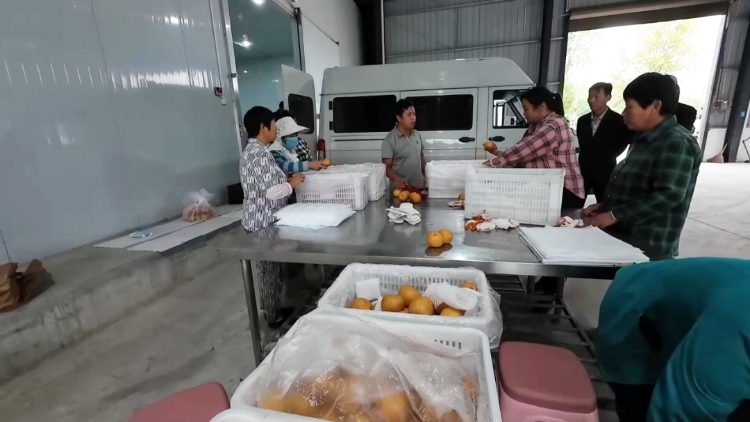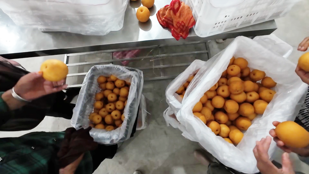 从晒谷场往村外走不远,连片的金果梨基地映入眼帘,硕大的果实挂满枝头,村民们穿梭在果树间,熟练地采摘成熟的金果梨,随后运往基地配套的冷库储存。