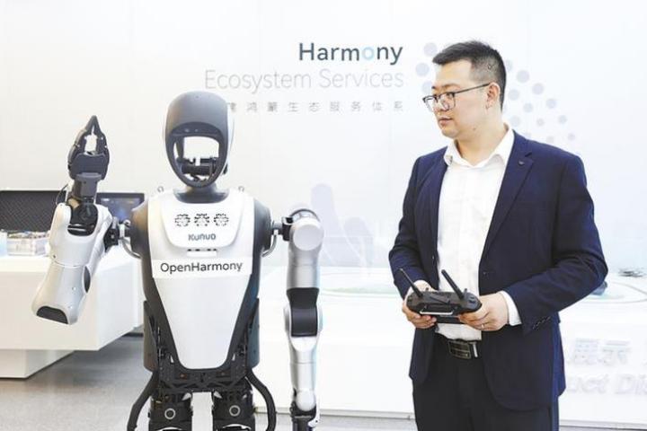 10月28日,全国首款搭载鸿蒙系统的人形机器人正在调试中。