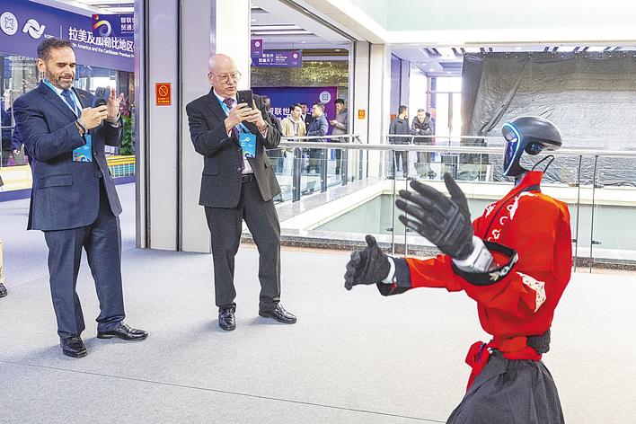 参加汉交会的巴拿马驻华大使雷鸣拿起手机拍摄机器人舞蹈。(湖北日报全媒记者 倪娜 通讯员 黄宣 刘春 摄)