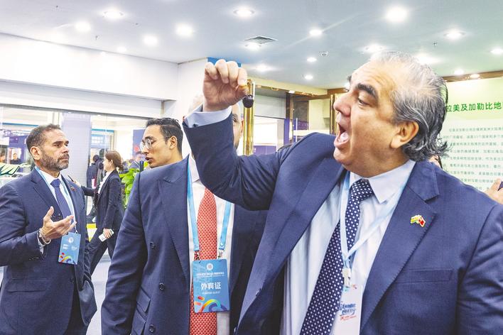 参加汉交会的玻利维亚驻华大使乌戈·西莱斯现场品尝智利车厘子。(湖北日报全媒记者 倪娜 通讯员 黄宣 刘春 摄)