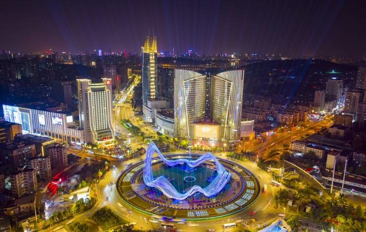 武汉光谷广场地标“星河”雕塑灯光璀璨,象征中国光谷独树一帜,光耀全球。