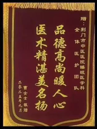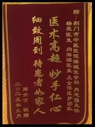 来自失眠患者刘女士的感谢锦旗,讲述了一段从辗转难眠到安心入睡的温暖故事。她曾辗转宜昌多家医院治疗,效果始终不尽如人意,于是专门慕名从宜昌来到荆门市中医医院睡眠医学科。