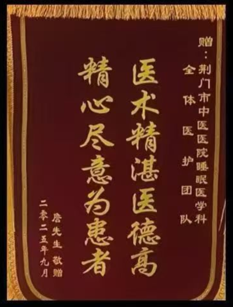 荆门市中医医院睡眠医学科团队通过「精准评估+个性化认知行为疗法」,配合专业的心理疏导,以精湛医术和暖心关怀,为她打破了“睁眼到天明”的恶性循环,让她重新拥有了久违的安稳睡眠。锦旗上“医德高尚暖人心,医术精湛传四方”的话语,道出了刘女士荆门市中医医院睡眠医学科团队无尽的赞誉与感激。