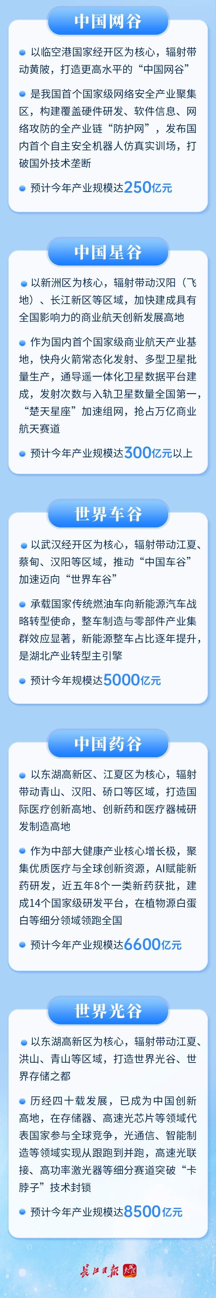 如今,光谷正打造全球科创标杆、车谷重塑汽车产业优势、星谷开拓空天经济新领域、网谷筑牢数字安全屏障、药谷赋能生命健康升级……“五谷”联动,正把武汉的增长线,拉向更宽图景、更高坐标。