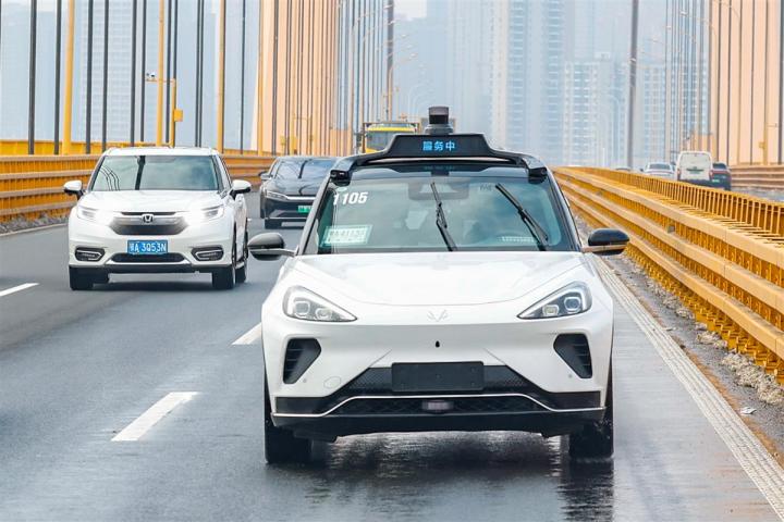 百度“萝卜快跑”全无人自动驾驶汽车在武汉杨泗港长江大桥桥面上行驶。(湖北日报全媒记者 倪娜 摄)