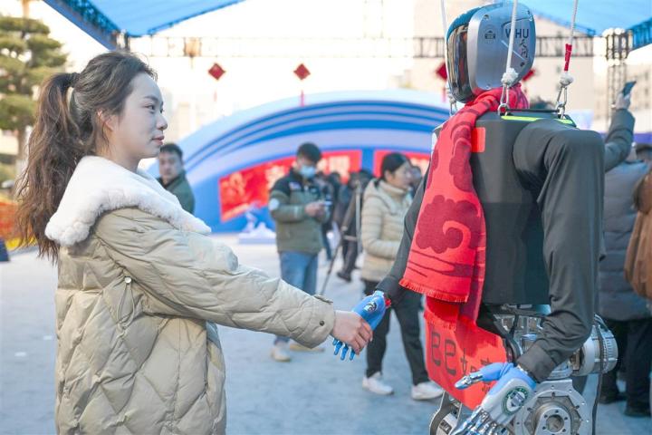 “新春第一会”上,“天问”与观众握手。(湖北日报全媒记者 田佩雯 摄)