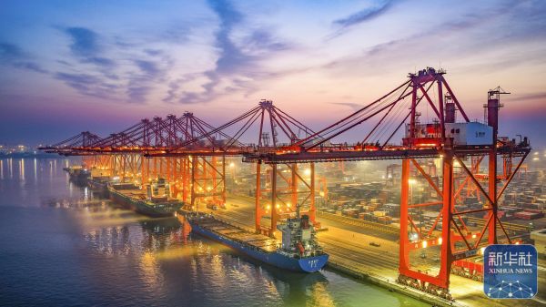 ↑ 12月15日,在山东港口青岛港,货轮在装卸外贸集装箱(无人机照片)。新华社发(俞方平摄)