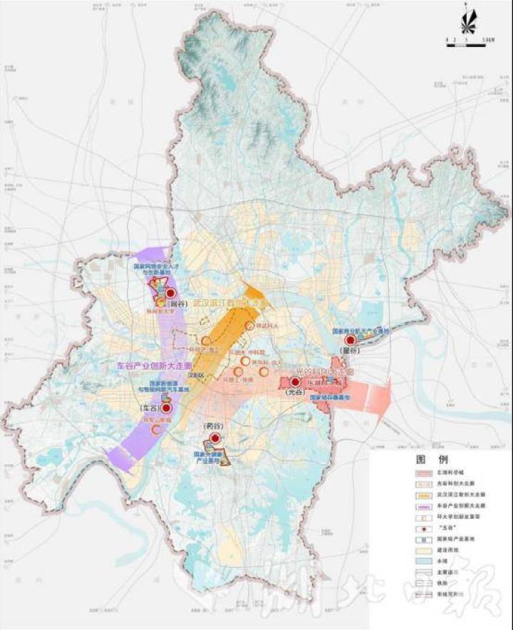 “一城三廊一带”是武汉通过优化空间载体,提升创新体系整体效能的新布局。“一城”指东湖科学城,侧重于策源能力突破,打造原始创新高地。“三廊”指光谷科技创新大走廊、车谷产业创新大走廊、武汉滨江数创大走廊,侧重发挥出廊道的延展性特点,以点带面、沿线铺开,形成全域布局,推动科产融合,打造产业创新高地。“一带”指环大学创新发展带,以它盘活武汉的高校资源,吸引高校师生就近创新创业,打造成果转化载体。