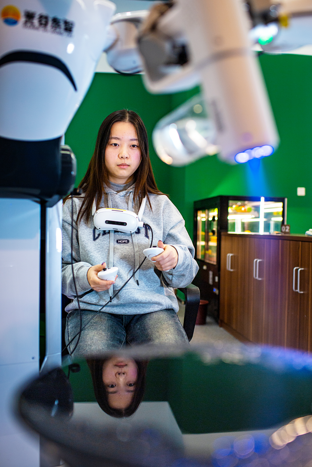 仿真咖啡厅场景区,机器人训练师瞿琼彬操控机器人喷洒消毒液。(朱熙勇|摄)