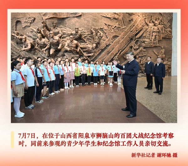 7月7日,时值全民族抗战爆发88周年,山西阳泉狮脑山巅,骤雨初歇。站在中国共产党领导军民挥洒热血、英勇战斗过的土地,习近平总书记嘱托来参观百团大战纪念馆的青少年学生:“前事不忘,后事之师。孩子们要争做民族的脊梁,一定要把我们国家建得更加强盛。”