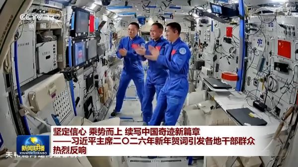 远在约400公里高空的神舟二十一号航天员张陆、武飞、张洪章,在中国空间站同步收看了习近平主席的新年贺词。在轨两个月,他们开展了首次出舱活动,有序推进一系列太空实(试)验。