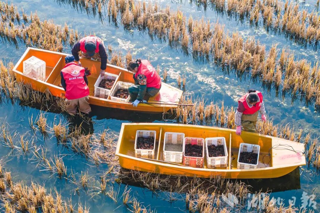 在潜江市龙湾镇郑家湖“四季有虾”养殖基地,虾农们正在捕捞小龙虾。(任勇|摄)