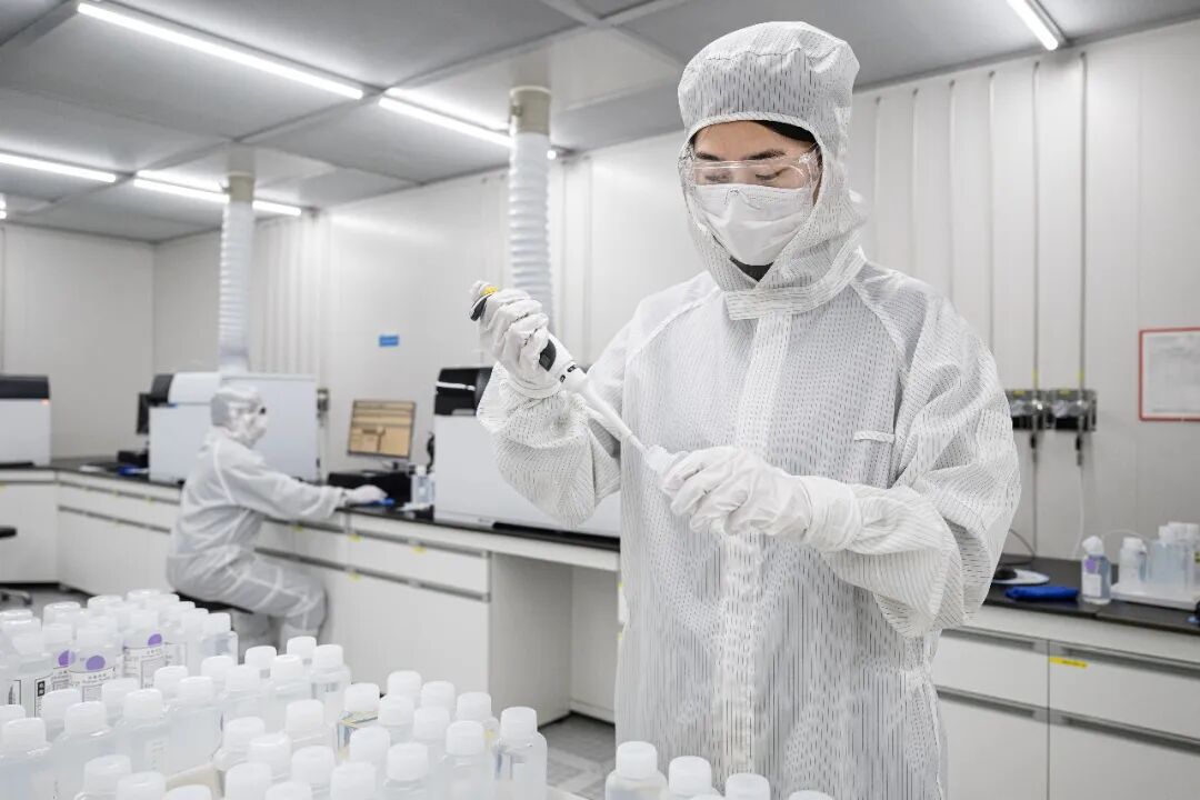晶瑞(湖北)微电子材料有限公司研发中心百级洁净实验室内,技术人员正在进行样品检测。(任勇|摄)