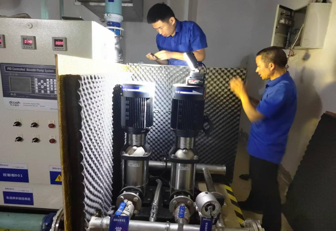 工作人员在双喜还建小区三期水泵房加装隔音箱