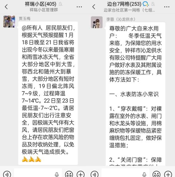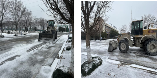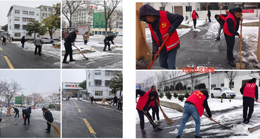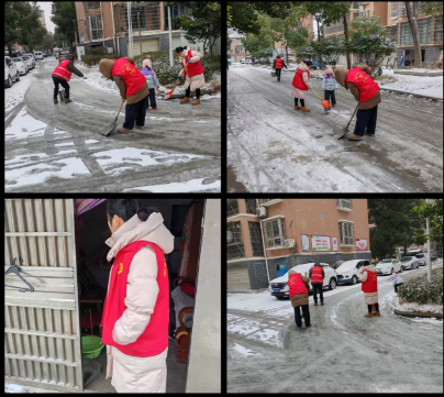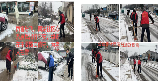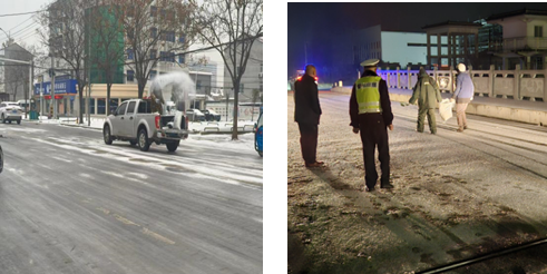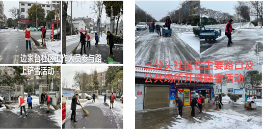 四是做好应急防范。储备工业盐3吨,预备铲雪机械5台、人员150人,以及部分油锯、铁锹 、铁镐等应急物资,确保应急状态下能够快速调用。安办、城管办与公安交警部门协同配合,对南湖河桥等四座桥梁开展撒盐防冻作业,全力保障道路畅通与市民出行安全;社区“红马甲”志愿者主动上路协助疏导交通,交警及辅警全员上岗执勤;组织机关、社区、单位干部职工,发动党员群众共计100余人,对各单位院落及门前区域的积雪结冰开展集中清理,协调水管站出动机械车2台参与作业。