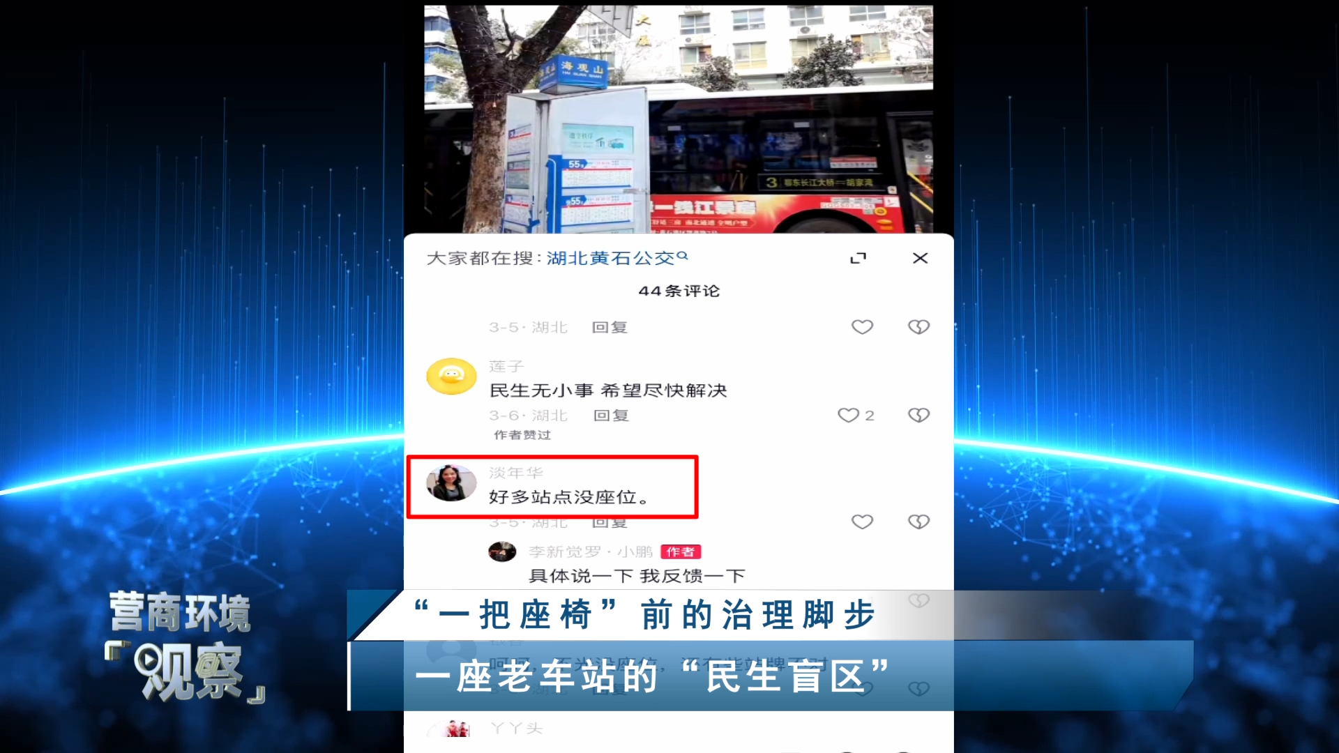 黄石港区市建村社区网格员 陈珑:同样是公交站,有的有座椅,有的没有,确实让群众不好理解,也影响了大家的出行感受。